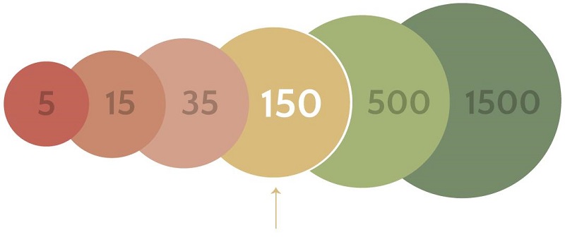 Illustrative image showing the Dunbar number and the different groups size